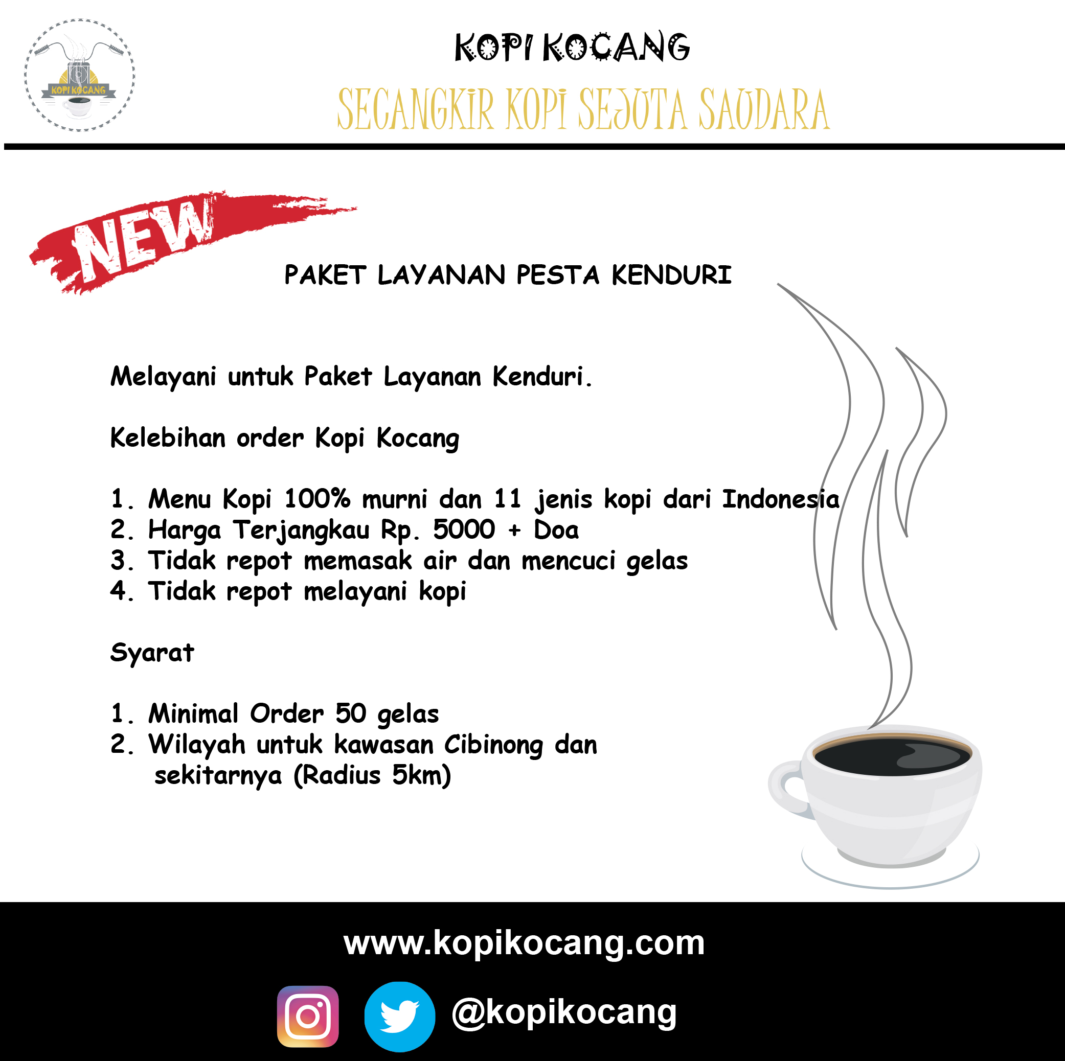 Kopi Kocang hadir dengan konsep keliling dengan branding dan ciri khas sendiri, dikemas dalam kemasan eksklusif tetapi harga merakyat. Kopi Kocang akan hadir di acara-acara komunitas, di tempat pesta rakyat, kampus dan tempat komunitas berkumpul. karena kami memiliki tagline “Secangkir Kopi Sejuta Saudara”