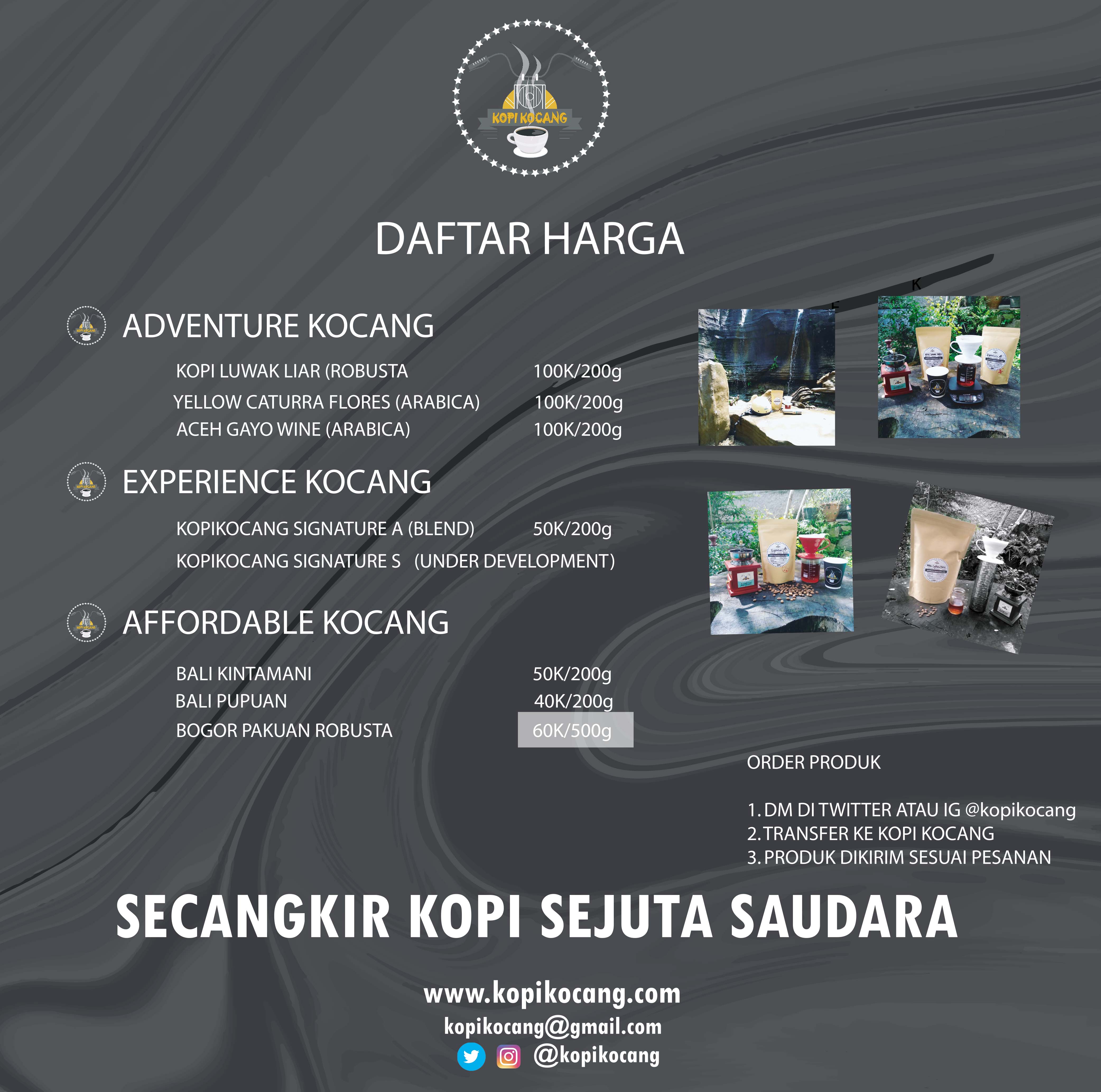 Kopi Kocang menggunakan Kopi hasil petani Indonesia, Produk andalan kami adalah Kopi LUWAK LIAR ASLI dari pegunungan Cisadon di daerah Bogor.